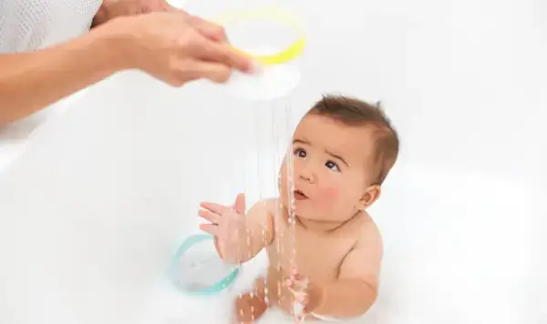 เอาของเล่นเข้ามา. หากลูกของคุณสามารถทนเวลาอาบน้ำได้นานขึ้นอีกหน่อย ให้เพิ่มของเล่นเพื่อทำให้เวลาสนุกสนานยิ่งขึ้น Transparent Tube Tower และ Nesting Stacking Drip Drop Cups ล้วนช่วยเพิ่มความสนุกสนานให้กับการอาบน้ำ และช่วยให้บุตรหลานของคุณได้สำรวจคุณสมบัติของน้ำ